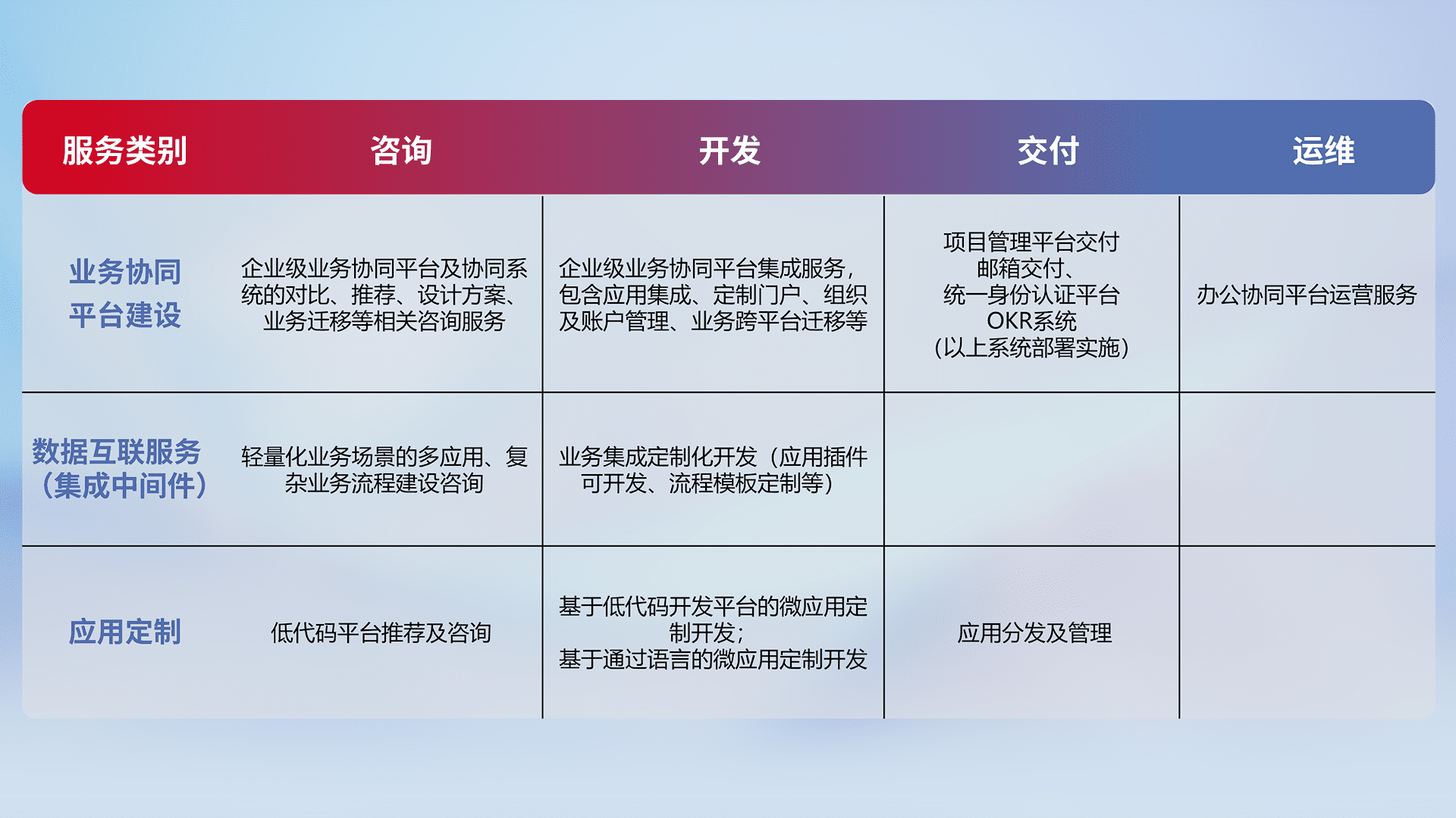 针对钉钉、、企微、、、IDaas等平台级产品提供产品的规划、、、、方案、、交付、、、定制化开发等服务,,实现如统一协同办公、、、智能客户服务、、混合会议管理、、、智能数据查询、、等业务场景,,,实现数字化转型。。。。