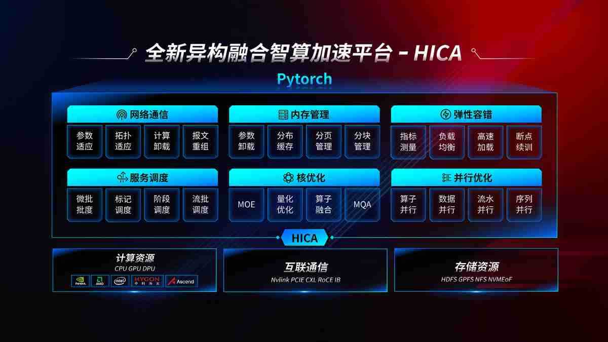 通过自研的服务层、、、、中间适配层、、、以及调度编排算法,,采用数据并行、、、、模型并行等多种并行方式,,把并行计算任务进行有效的分解,,,使其分别由相应的软件栈和算力资源来承接。。。。当GPU资源变化,,,HICA可以实时动态调度计算子任务并调整模型拓扑和架构,,以充分聚合各种算力资源。。